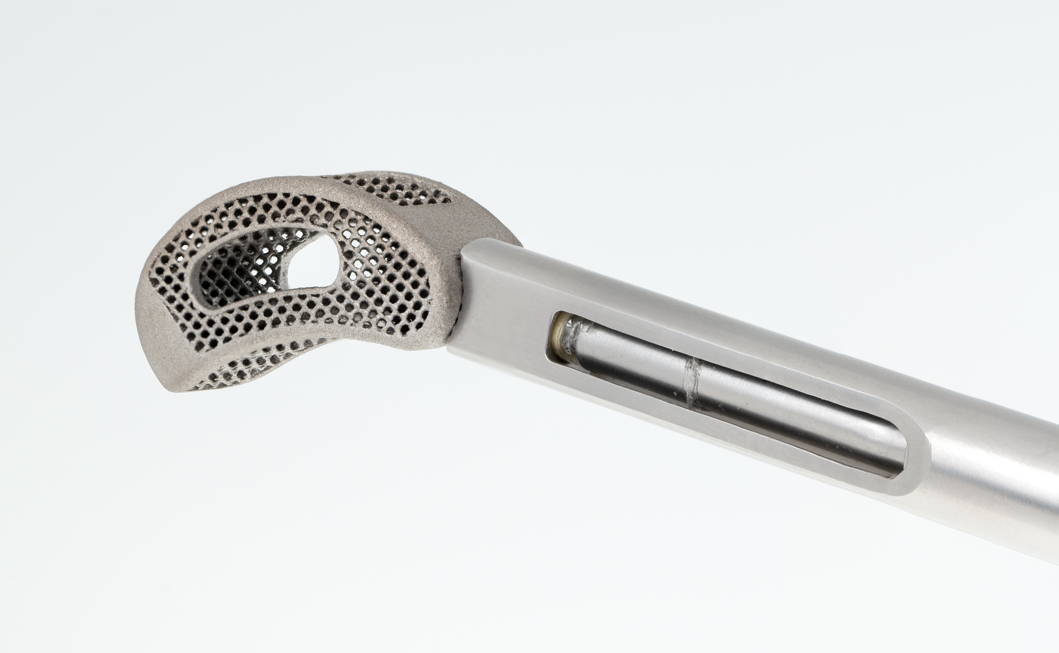 The print is made using selective laser sintering (SLS), one of the most common metal 3D printing solutions. It is a powder bed fusion process in which powder particles are locally fused together within a thin layer of metal powder using CAD data to create a three-dimensional geometry by the cohesion of successive layers. This method ensures the creation of a durable and implantable final product while allowing great freedom of form, particularly suitable for crafting shapes with complex geometries.